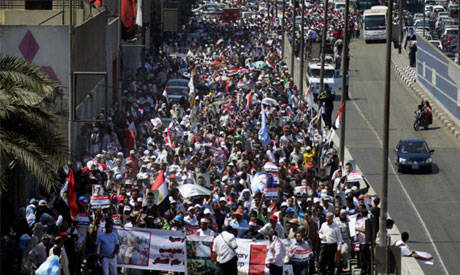 Hundreds of pro-Morsi protesters have gathered at the High Court on Ramses Street, a main road in downtown Cairo. They were joined by another march by several thousands of Morsi supporters moving from the Engineers’ Syndicate building on Ramses.