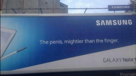 The original idiom, ‘The pen is mightier than the sword’ is now displayed by Samsung as ‘The penis, mightier than the finger’.