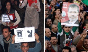 On Tuesday evening, three miles away from Rabaa Al-Adawiya mosque in Cairo’s Nasr City where supporters of the president had gathered, tens of thousands of anti-Morsi demonstrators were rallying at the presidential palace to protest Saturday’s constitutional referendum.