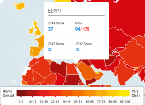 Egypt witnessed big improvements in public sector’s corruption in the year 2014, according to Corruption Perceptions Index. As it’s score rises to 37 in 2014 from 32 in 2013, Egypt comes among the biggest improvers along with Côte d´Ivoire, Saint Vincent and the Grenadines (+5)