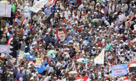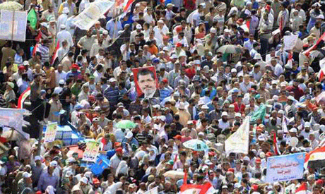 Friday’s mass gathering was ostensibly called by Islamists to denounce violence, but it took on the appearance of a war rally instead. Participants, many of them bearded and wearing robes or green bandanas, vowed in chants to protect Morsi against his opponents. Some who addressed the crowd spoke of smashing opposition protesters on June 30, the anniversary of Morsi’s assumption of power.