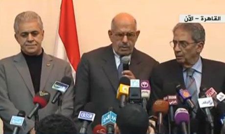ElBaradei was flanked by former presidential candidates Hamdeen Sabbahi and Amr Moussa, both of whom have joined the reform campaigner in establishing a “National Salvation Front” to oppose Morsi’s controversial decree.