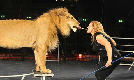 In the video clip, renowned lion trainer and circus owner Faten El-Helw is waving to her audience at the Egyptian-European Circus, when one of her lions suddenly springs on her. “Bushart Kheir”, a popular nationalist song associated with the 2013 presidential elections, is playing in the background.