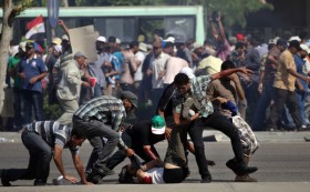 Combatants used rocks, sticks, fireworks and Molotov cocktails in a battle lasting hours that raged near Tahrir Square and across a bridge spanning the Nile, part of the most widespread street violence in Egypt since the early days of the 2011 revolution.